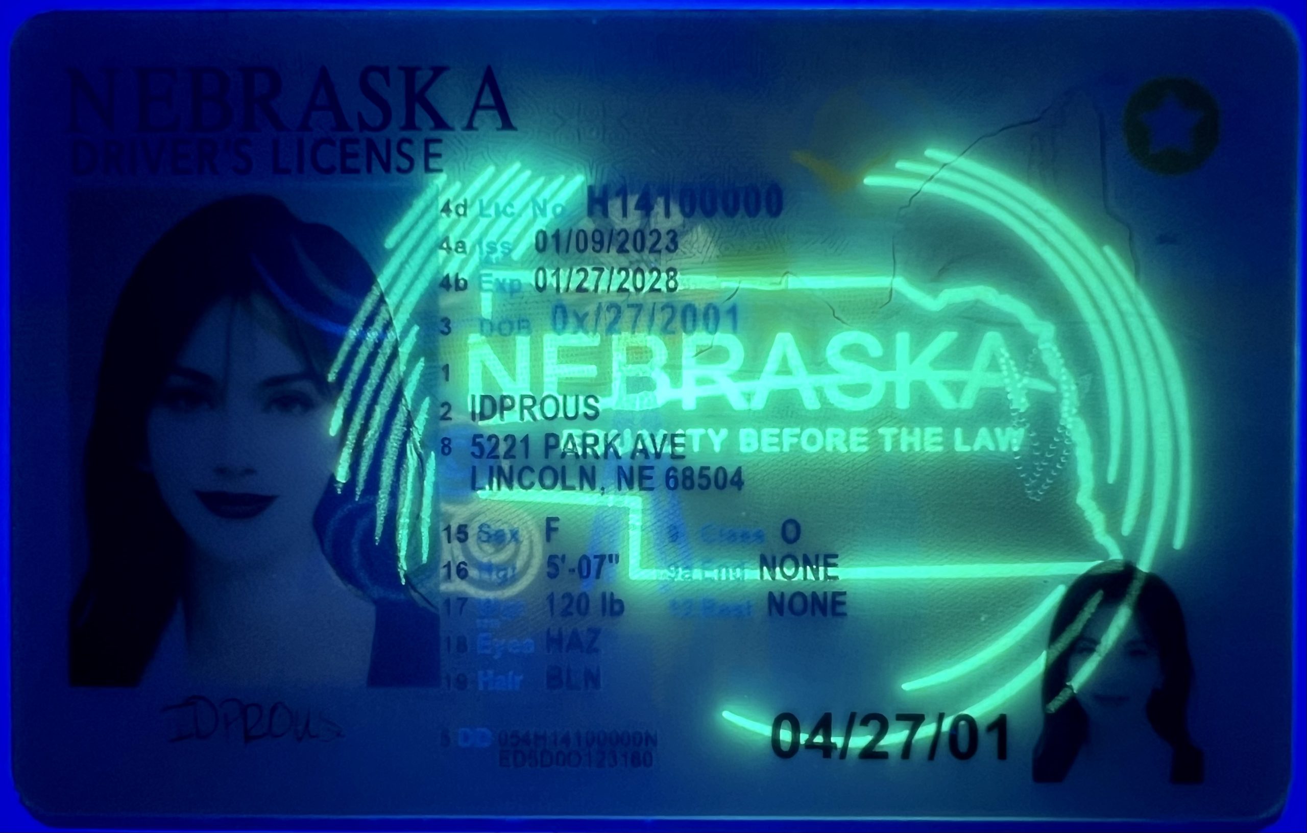 Nebraska IDs are typically printed on durable PVC or polycarbonate using high-resolution printing technology.