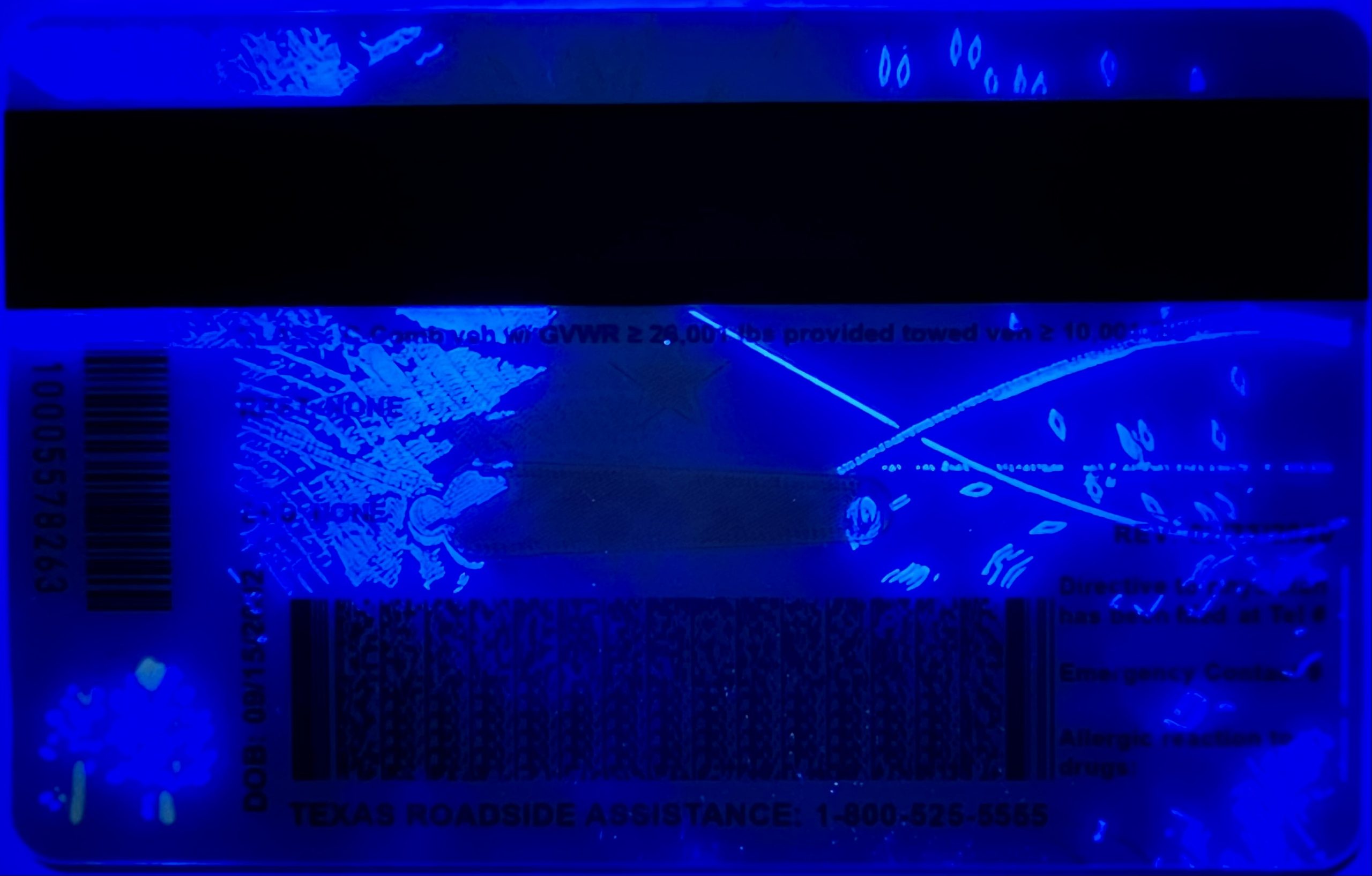 This ID card includes a holographic overlay featuring the Bluebonnet, the state flower of Texas. This characteristic not only enhances the state’s unique identity but also adds to the ID’s authenticity.